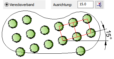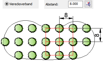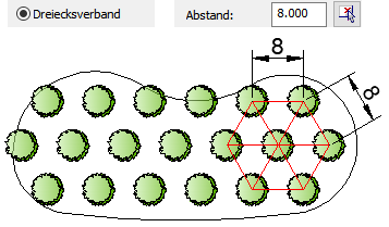 Beim Dreiecksverband werden die Details in versetzten Reihen angeordnet. Die Einfügepunkte jeweils dreier Details ergeben hierbei ein gleichseitiges Dreieck, dessen Seitenlänge dem gewählten Abstand entspricht. Der Detailabstand lässt sich auch grafisch zeigen, indem die dazugehörige Schaltfläche betätigt wird. |