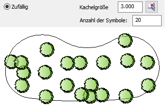Bei der zufälligen Verteilung werden die Details gemäß der festgelegten Anzahl nach einem Zufallsprinzip innerhalb der Fläche angeordnet. Die Blöcke werden hierbei zufällig auf virtuelle Kacheln verteilt. Der Wert der Kachelgröße variiert die Verteilung, beschränkt aber auch die maximal mögliche Anzahl der Details, da höchstens ein Detail pro Kachel verwendet wird. Da die Verteilung zufällig und nicht gleichmäßig ist, muss u. U. nachgearbeitet werden, um zu einer optisch ansprechenden Verteilung zu gelangen. |