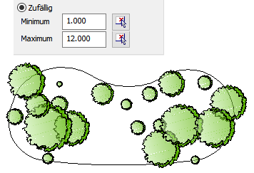 Bei einem zufälligen Skalierfaktor variiert dieser zufällig innerhalb eines einzugebenden Minimum- und Maximum-Werts. Die Werte können auch grafisch nach Betätigung der dazugehörigen Schaltflächen gezeigt werden. Hierbei kann die Größe des Details mit der Maus gleichmäßig aufgezogen werden. |
