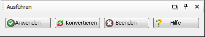 Dieses Fenster stellt die üblichen Schaltflächen dar, welche in Standard-Dialogen für gewöhnlich am unteren Dialogbereich fest platziert sind. Neben der Hilfe und dem Beenden (Verlassen) stehen noch Schaltflächen für das Anwenden eines Objektes und dessen Variationen (z. B. Konvertieren o. ä.) bereit.