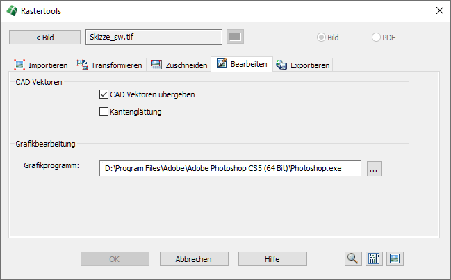Eine Bearbeitung des Pixelbildes ist i. d. R. nur dann erforderlich, wenn Zeichnung und Pixelbild hybrid ausgegeben werden und in diesem Zusammenhang Bereiche des Pixelbildes editiert (z. B. gelöscht) werden müssen. Meist ist aber eine sinnvolle Bildeditierung nur dann möglich, wenn darüber liegende Zeichnungsvektoren bekannt sind. Über die Funktion CAD Vektoren übergeben können aktive CAD-Objekte an das unten ausgewählte Grafikprogramm übergeben werden.
