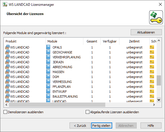 Anmerkung: Demolizenzen und abgelaufene Lizenzen können mittels Optionsschaltern aus der Anzeige ausgeblendet werden. Durch Aktivierung der Option "Nur folgende Lizenzschlüssel anzeigen", lässt sich die Anzeige der Lizenzschlüssel auf bestimmte, im Konfigurationsdialog von WS LANDCAD festgelegte Schlüssel begrenzen. Dadurch kann z. B. die Anzeige anderweitig nicht mehr verwendbarer Lizenzschlüssel verhindert werden. Die Schaltfläche Aktualisieren führt eine manuelle Aktualisierung des Lizenzzustandes durch.