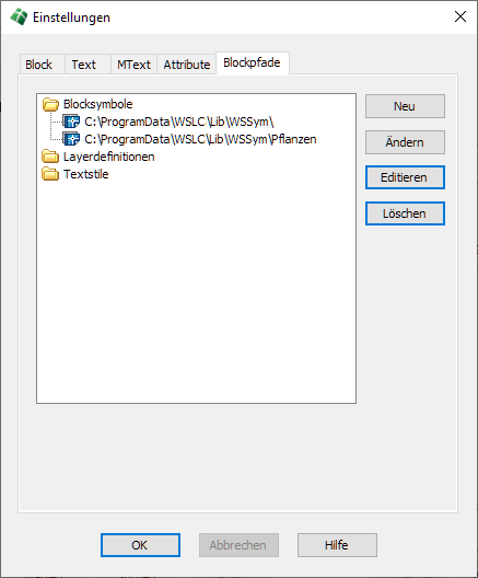 Anmerkung: Alle Eintragungen in den Blockpfaden werden nur dann ausgewertet, wenn die jeweiligen Objekte bzw. Definitionen nicht in der aktuellen Zeichnung vorhanden sind. Anderenfalls gelten immer die Inhalte der aktuellen Zeichnung. |