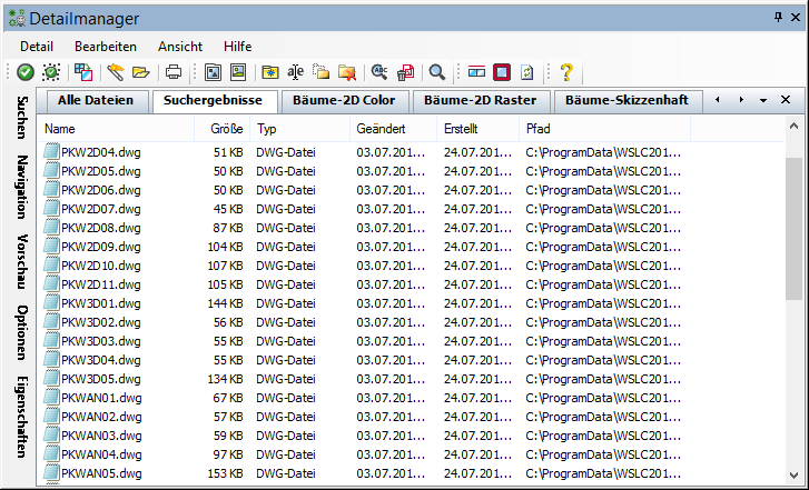 Grafische ManagerKomponenten des ProgrammfenstersAnzeigemodus Details In der Detailansicht werden die Objekte nach ihrem Dateinamen, der Dateigröße, dem Dateityp, dem Erstellungs- und Änderungsdatum sowie dem Pfad aufgelistet.