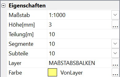 - Layer - Der Layer des Maßstabsbalkens wird mit Hilfe der zentralen Layersteuerung festgelegt. Sobald Sie in das Layerfeld klicken, erscheint eine gepunktete Schaltfläche [...], welche die zentrale Layersteuerung öffnet, mit deren Hilfe Sie einen Vorgabelayer spezifizieren können. Auf die gleiche Art lässt sich die Farbe spezifizieren, falls diese nicht den empfohlenen Standardwert VonLayer besitzen soll.