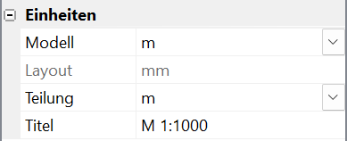 Im Feld Modell wird die zu verwendende Einheit des Modellbereichs [m oder Zoll] aus der Klappliste ausgewählt, wodurch die Einheit des Papierbereichs (Layout) automatisch gegeben ist. |