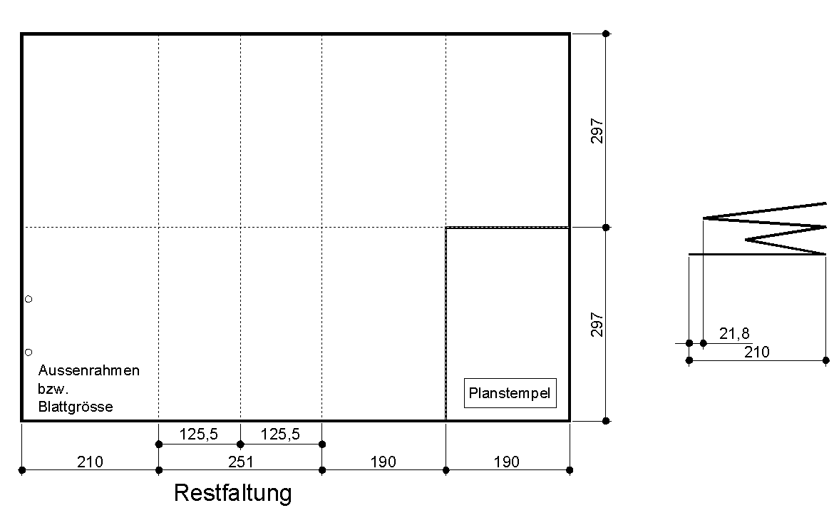 - Heftrand – Der Heftrand dient zum Abheften (Lochen) der Zeichnung und wird als Normalwert (20 mm) und Minimalwert (16 mm) angegeben. Blattbreite minus Heftrand ergibt die Norm-Faltbreite (z. B. 190 mm)