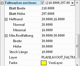 Faltmarken dienen zur Hilfe bei der Faltung einer geplotteten Zeichnung im (DIN A4-) Ablageformat. Das Programm orientiert sich hierbei an der DIN 824 Blattfaltung auf Ablageformat und erweitert diese nach einem komplexen Algorithmus auch auf freie Blattgrößen. So werden zusätzlich zu den normalen Kenngrößen des Blattes (Blattbreite = i. d. R. 210 mm und Blatthöhe = i. d. R. 297 mm) folgende Kenngrößen definiert, um zu einer zuverlässigen und praxisgerechten Blattfaltung zu gelangen: |