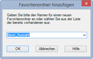 Nach der Auswahl des Befehls erscheint der Dialog Favoriten anlegen, in welchem ein prägnanter Name für einen neu anzulegenden Favoriten angegeben werden kann. Nach der Bestätigung entsteht ein zunächst leerer Favoritenordner am Ende der verfügbaren Register. Durch Betätigung des Pfeilschalters wird eine Liste aller bereits vorhandenen Favoriten eingeblendet, auch wenn diese aktuell deaktiviert sein sollten. Dadurch ist einerseits ein Überblick über die existenten Favoriten gegeben, andererseits lässt sich dadurch ein deaktivierter Ordner wieder einblenden. |