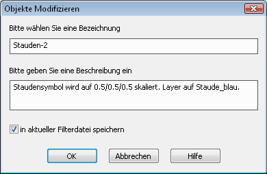 Ein Modifikationsfilter lässt sich durch Auswahl des Befehls Filter → Speichern oder durch Betätigung des Filtericons speichern. Das ursprünglich blaue Filtericon wird unterstützend rot, wenn die aktuellen Filtereigenschaften geändert werden. In dem daraufhin erscheinenden Dialog geben Sie bitte eine treffende Bezeichnung für den Filter ein. Im separaten Beschreibungsfeld haben Sie zudem die Möglichkeit, die Aktion des Filters detaillierter zu beschreiben. Die Option in aktueller Filterdatei speichern ist i. d. R. aktiviert, damit der flüchtige Filter auch physikalisch in der aktuellen Filterdatei gespeichert wird. |