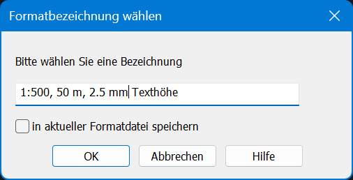 Ein Maßstabsformat lässt sich durch Auswahl des Befehls Objekt → Format speichern oder durch Betätigung der Maßstabsicons speichern. Das ursprünglich weiße Icon wird unterstützend rot, wenn die aktuellen Formateigenschaften geändert werden. In dem daraufhin erscheinenden Dialog geben Sie bitte eine treffende Bezeichnung für das Format ein, welche frei definierbar ist. |