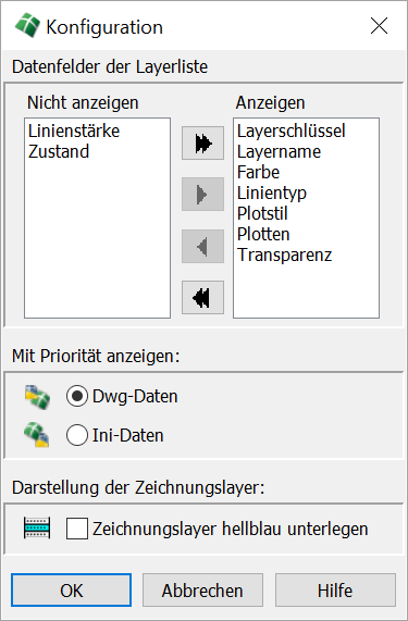 Mit dem Konfigurationsdialog lässt sich die Anzeige der Layerlisten steuern. So können die vorhandenen Eigenschaften beliebig aktiviert oder deaktiviert werden, indem sie markiert und durch Betätigung der Pfeiltasten in die Spalte Anzeigen oder Nicht anzeigen gelegt werden. Die Doppelpfeile stehen jeweils für die automatisierten Funktionen >> Alle Anzeigen oder <<Nur Layer-Schlüssel und Name anzeigen. Die Reihenfolge der Anzeige lässt sich auch verändern, indem zunächst die Eigenschaften auf die linke Seite und anschließend nacheinander in der gewünschten Reihenfolge auf die rechte Seite gelegt werden. Wurden Layereigenschaften in der Zeichnung nachträglich geändert, können per Vorgabe entweder die DWG- oder die Ini-Daten (Layerdatei) angezeigt werden. Zur Verdeutlichung von Zeichnungslayern können diese durch Aktivierung eines Schalters zusätzlich hellblau unterlegt werden. |