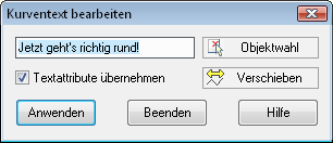 Die Wahl eines vorhandenen Kurventextes öffnet den ähnlichen Dialog Kurventext bearbeiten, welcher den Textinhalt automatisch in die Eingabezeile übernimmt. Sie können nun den Text editieren und/oder den Text entlang der ursprünglichen Kontur verschieben. |