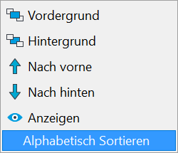 Im Kontextmenü steht neben den Befehlen für Vordergrund, Hintergrund, Nach vorne, Nach hinten und Anzeigen auch der Befehl "Alphabetisch Sortieren" zur Verfügung, welche die jeweilige Liste alphanumerisch sortiert. |
