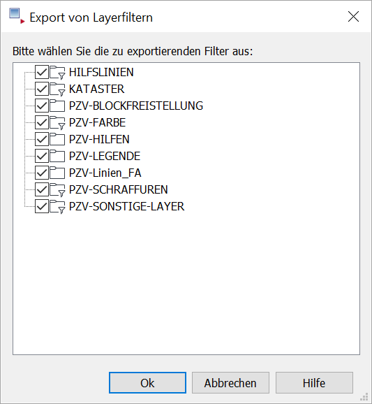 Vorhandene Layerfilter lassen sich jederzeit in eine externe Layer-Struktur-Datei (*.ltp) exportieren. Hierbei erscheint der Dialog "Export von Layerfiltern", welcher sowohl Gruppenfilter als auch Eigenschaftenfilter enthalten kann. Die gewünschten Inhalte lassen sich mit dem jeweiligen Häkchen an- bzw. abwählen. Der Filter "alle Verwendeten Layer" wird nicht angezeigt. Hierbei handelt es sich um einen automatisch vom CAD-System erzeugten Filter, welcher nicht für Operationen zur Verfügung steht. |