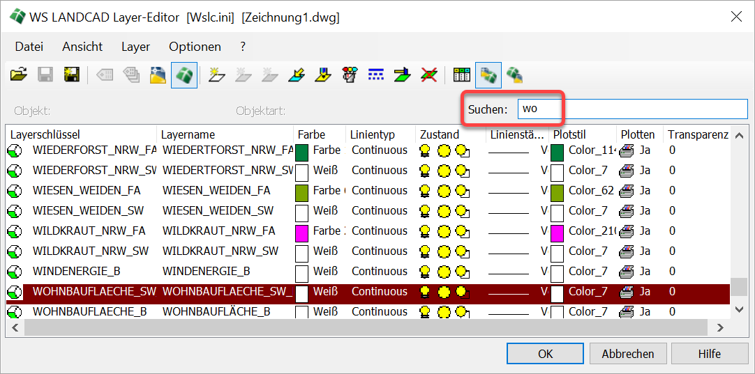 Besonders bei großen Layerlisten kann es mitunter recht umständlich sein, zu einem gewünschten Layereintrag zu scrollen. Sie können daher im Editierfeld "Suchen:" die Anfangsbuchstaben des Layers eingeben, wobei sich der Layerdialog automatisch auf den ersten Layereintrag positioniert, der mit der Sucheingabe beginnt. Für den Suchbegriff wird Groß- und Kleinschreibung ignoriert. Wildcards, z. B. *, sind nicht zulässig.