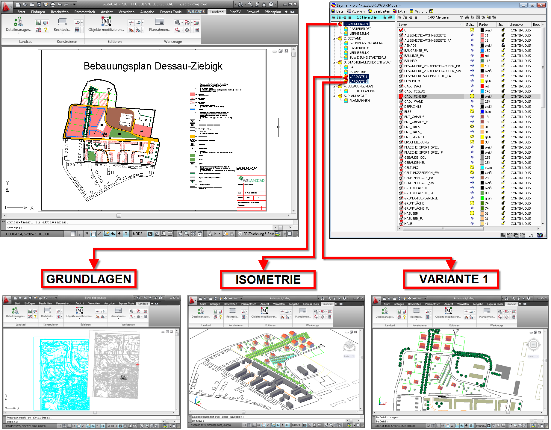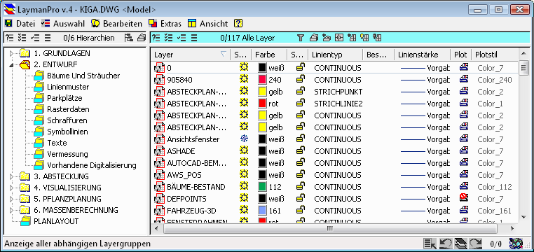 Über den Layermanager stehen dem Anwender verschiedene Funktionen zur Layersteuerung und -strukturierung zur Verfügung. Die Layer lassen sich hierbei in Gruppen und Hierarchien zusammenfassen. Layergruppen verbessern nicht nur die Übersichtlichkeit der Zeichnung - sie bieten auch Möglichkeiten zur schnellen Layersteuerung.