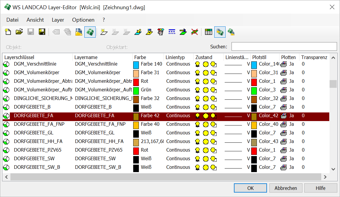 WS LANDCAD besitzt eine zentrale, benutzerabhängige Layersteuerung, auf die insbesondere die grafischen Manager, aber auch viele andere Programmteile zurückgreifen. Diese Layersteuerung hat im Wesentlichen die Aufgabe, objektbezogene Vorgabelayer für die verschiedensten Operationen, z. B. das Einfügen eines Details, eines Planzeichens oder das Zeichnen einer Vegetationslinie, zur Verfügung zu stellen. Die zentrale Layersteuerung wird durch die Schaltfläche LAYER in den jeweiligen Dialogboxen einer WS LANDCAD-Funktion automatisch aktiviert, ist aber auch unabhängig davon durch Betätigung des Befehls "Layer → Layersteuerung" aufrufbar. Das Prinzip basiert darauf, dass einem Objekt, z. B. einem Planzeichen, einer Schraffur oder einem Block ein sog. Layerschlüssel zugeordnet wird, dessen Eigenschaften, wie z. B. tatsächlicher Layername, Farbe oder Linientyp Layer in einer Layersteuerdatei definiert ist. WS LANDCAD benutzt die zentrale Layersteuerdatei WSLC.INI, in welcher i. d. R. alle Layer definiert sind, die durch eine WS LANDCAD-Funktion erzeugt werden. Die Steuerdatei WSLC.INI wird als Werksvorgabe in die jeweiligen User-Verzeichnisse kopiert und kann vom Anwender beliebig angepasst werden. Auch die Verwendung anderer Steuerdateien ist möglich.