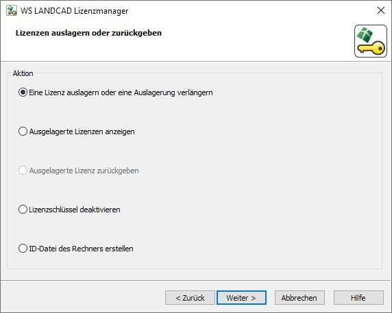 WS LANDCAD-Lizenzen sind generell portierbar, d. h. lokale Lizenzen können deaktiviert und auf einem anderen Rechner aktiviert werden. Auch das Auslagern (Leihen) von Lizenzen von einem Lizenzserver (Netzlizenz) auf andere Rechner (Einzelplatz) wird unterstützt.