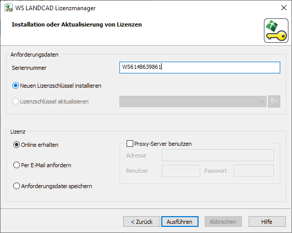 Die Seriennummer, mit der Ihre WS LANDCAD-Version installiert wurde, wird i. d. R. selbstständig ermittelt. Falls dies nicht der Fall sein sollte, geben Sie bitte die Seriennummer in das dafür vorgesehene Feld unter den Anforderungsdaten ein. Anschließend wählen Sie bitte eine der folgenden Methoden, um die Lizenz auf Ihrem Rechner zu aktivieren: