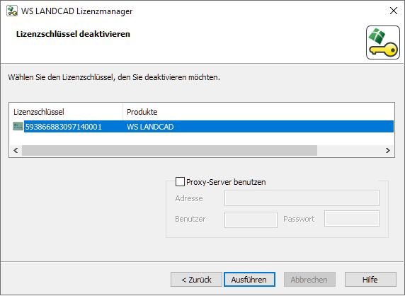 Im nachfolgenden Dialog ist zunächst der Lizenzschlüssel zu wählen. Bei einer WS LANDCAD-Einzelplatzlizenz ist i. d. R. nur ein Schlüssel für das aktuelle Produkt vorhanden und daher schon ausgewählt. Zur Deaktivierung des Schlüssels ist analog zur Lizenzierung eine funktionierende Internetverbindung obligatorisch. Optional kann hierbei auch ein Proxy-Server verwendet werden. Bitte geben Sie die entsprechenden Daten in die dafür vorgesehenen Felder ein, wenn Sie diese Option benötigen. Durch Betätigung der Schaltfläche Ausführen erscheint zunächst eine Rückfrage zur vorgesehenen Deaktivierung.