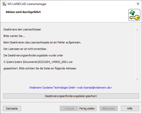 Die Deaktivierungsanforderungsdatei (*.wsr) muss dann per E-Mail zur Widemann Systeme GmbH geschickt werden, damit dort die Deaktivierung vorgenommen werden kann.