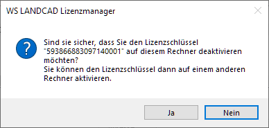 Mit dieser Funktion können Sie einen Lizenzschlüssel deaktivieren, um ihn z. B. für einen anderen Rechner verfügbar zu machen. Ein Deaktivieren bedeutet i. d. R., dass Sie die Lizenz für Ihren Arbeitsplatz entfernen. Dies ist dann notwendig, wenn Sie eine Lizenz von Ihrem Rechner auf einem anderen Rechner nutzen möchten oder wenn sich die Hardware Ihres Rechners grundlegend ändert. Wenn Sie z. B. Ihr Systemlaufwerk erneuern, sollten Sie zuvor den Lizenzschlüssel deaktivieren. Nachdem Ihr System wieder einsatzfähig ist, kann die Lizenz aktiviert werden.
