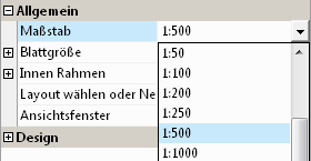 WerkzeugePlanrahmenPlanrahmen einstellen Maßstab Der Maßstab kann aus der Klappliste gewählt oder direkt in das Eingabefeld eingegeben werden. Dieser Maßstab ist nur dann relevant, wenn Sie den Planrahmen im Modellbereich anwenden.