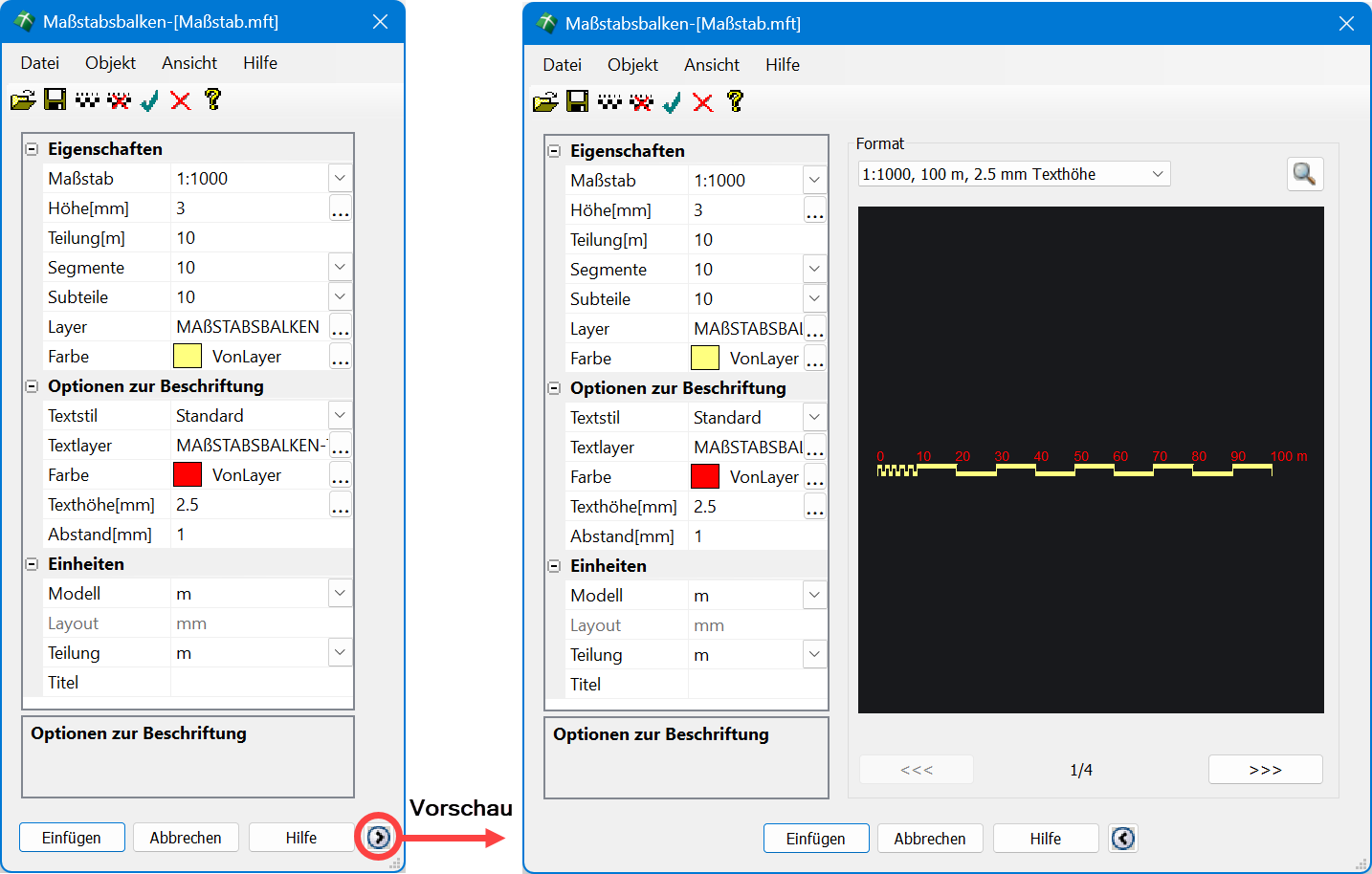 Der Aufruf des Befehls öffnet eine mit dem Planrahmen vergleichbare Dialogbox, in welcher alle zur Verfügung stehenden Parameter eingestellt werden können. Der aus den aktuellen Werten gebildete Maßstabsbalken wird jederzeit in der zoomabhängigen Echtzeitvorschau im erweiterten Dialogbereich visualisiert. Im erweiterten Dialogbereich kann aus der Klappliste ein Format gewählt werden, welches in einer Maßstabs-Formatdatei (*.mft) gespeichert ist.
