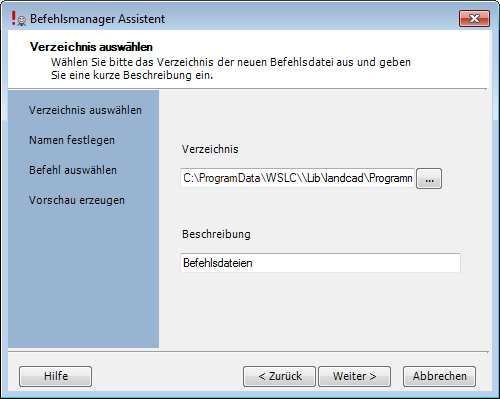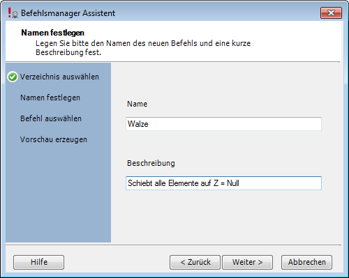 Im zweiten Schritt geben Sie bitte den Namen der Befehlsdatei an sowie eine kurze, prägnante Beschreibung. Die Beschreibung kann auch nachträglich jederzeit im Eigenschaftsfenster des Managers erstellt oder editiert werden. |