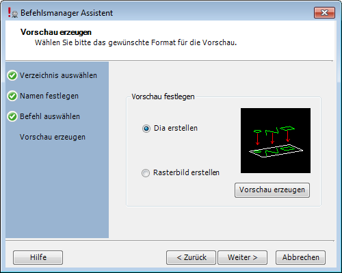 Die Einbindung einer neuen Befehlsdatei wird durch einen Assistenten geleitet, welcher nach Auswahl des Befehls Neu... aus dem Kontextmenü oder dem Pull- down-Menü Befehl erscheint. Da die Befehlsdatei durch ein Dia im Diamenü visualisiert wird, ist es günstig, zuvor eine kleine stellvertretende Zeichnung anzufertigen. Sie können das Dia aber auch später jederzeit updaten. |