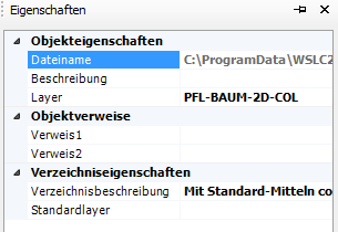 In den Objekteigenschaften werden die Beschreibung, der Dateiname sowie ein Vorgabelayer festgelegt. Die Beschreibung kann mehrzeilig sein und wird mit Hilfe eines Editors eingegeben, welcher durch eine Klappliste am rechten Zeilenrand geöffnet werden kann. Die Beschreibung erscheint auch als mehrzeiliger Tooltipp, wenn die Maus über der Beschreibung positioniert wird. |