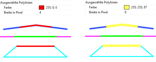 - Ausgewählte Polylinien – Der gewählte Bereich der ausgewählten Polylinien wird temporär hervorgehoben. Die Darstellung kann über Farbe und Breite in Pixel verändert werden.