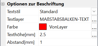 Hier werden die Parameter zur Beschriftung des Maßstabsbalkens eingestellt. Die Texthöhe kann entweder direkt in das Feld eingegeben oder aus einer Liste der vordefinierten Texthöhen gewählt werden, wobei hierfür die zentrale Texthöhen-Funktion verwendet wird. |