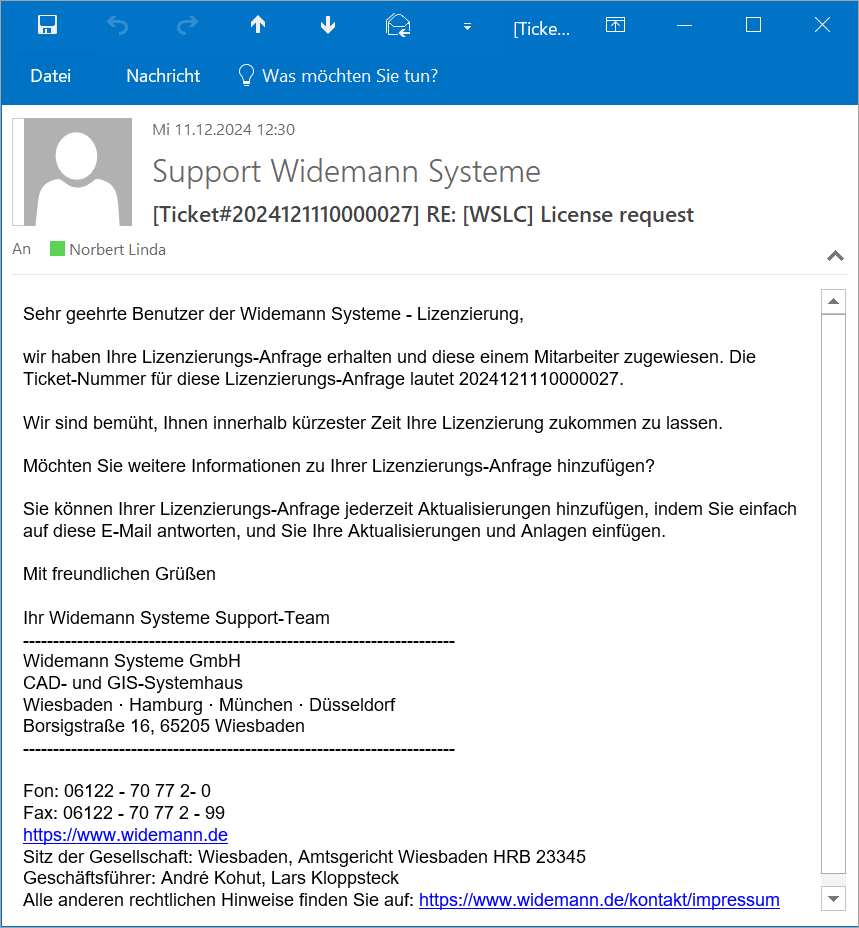 Lizenzanforderungen, die per E-Mail eingehen, müssen manuell bearbeitet werden. Sie erhalten daher eine Rückmeldung per E-Mail, die den Erhalt Ihrer Lizenzanforderung bestätigt. Ihre Lizenzanforderung wird von einem Mitarbeiter der Widemann Systeme GmbH überprüft und Sie erhalten i. d. R. innerhalb von 24 Stunden Ihre Freischaltung.