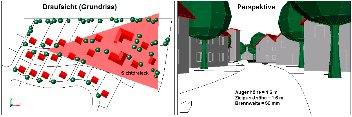 - Brennweite - Wenn Sie sich im Perspektive-Modus befinden, sind das Editierfeld Brennweite und der Button <Zeigen aktiviert. Mit der Brennweite steuern Sie die Weite des Sichtfeldes, vergleichbar mit dem Objektiv einer Kamera. Falls Sie bereits Standpunkt und Blickpunkt eingestellt haben, können Sie die Brennweite mit dem Button <Zeigen auch grafisch durch Veränderung des Sichtdreieckes bestimmen.