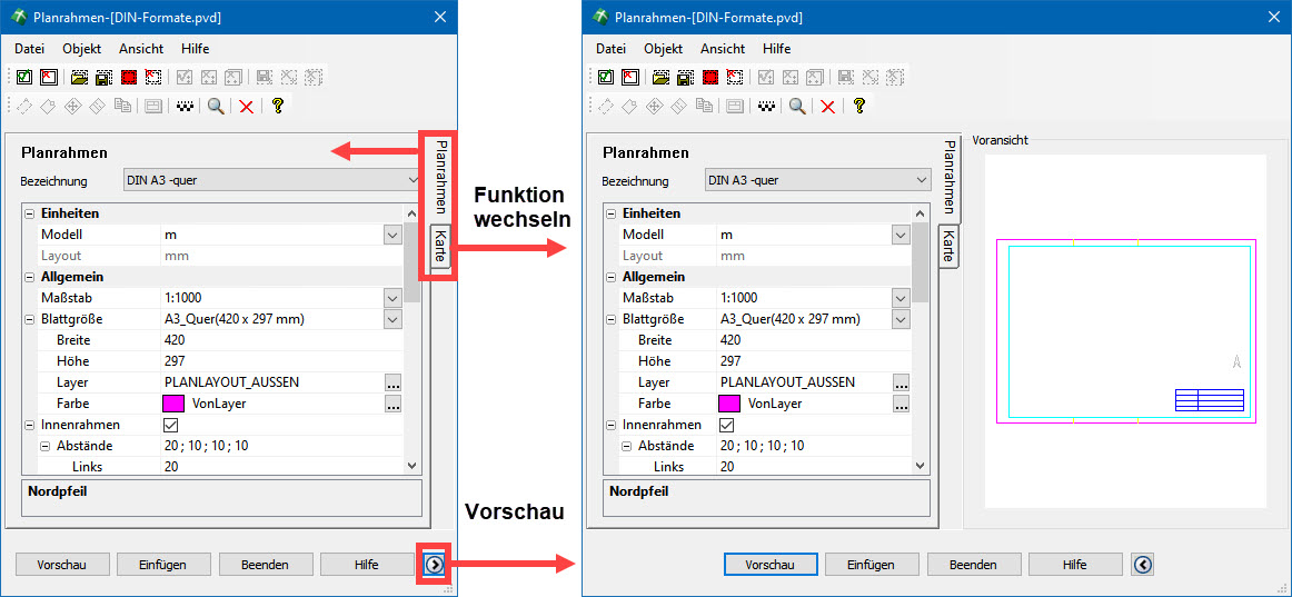 Durch Betätigung der senkrecht angeordneten Registerschalter kann das Programm jeweils in den Funktionsmodus Planrahmen oder Karte geschaltet werden. Der Dialogbereich kann aufgeklappt werden und beinhaltet eine schematische Echtzeitvorschau über die wichtigsten Parameter des Planrahmens.