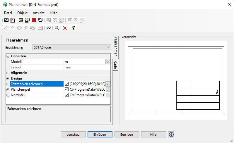 Nach der Auswahl der Vorlage werden alle Werte entsprechend eingestellt und eine schematische Voransicht wird in den erweiterten Dialog eingeblendet. Die Voransicht bietet eine proportionale Echtzeit-Darstellung der jeweiligen Eigenschaften, wobei der optionale Plankopf und Nordpfeil jeweils schematisch aber in den richtigen Dimensionen dargestellt werden.
