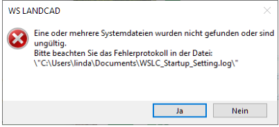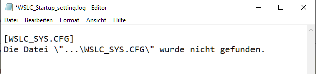 Bei einem gravierenden Fehler in der Installation erscheint eine Fehlermeldung beim Versuch, den Startmanager aufzurufen. Gefundene Fehler werden in der Datei WSLC_Startup_Setting.log protokolliert, welche automatisch angezeigt werden kann.
