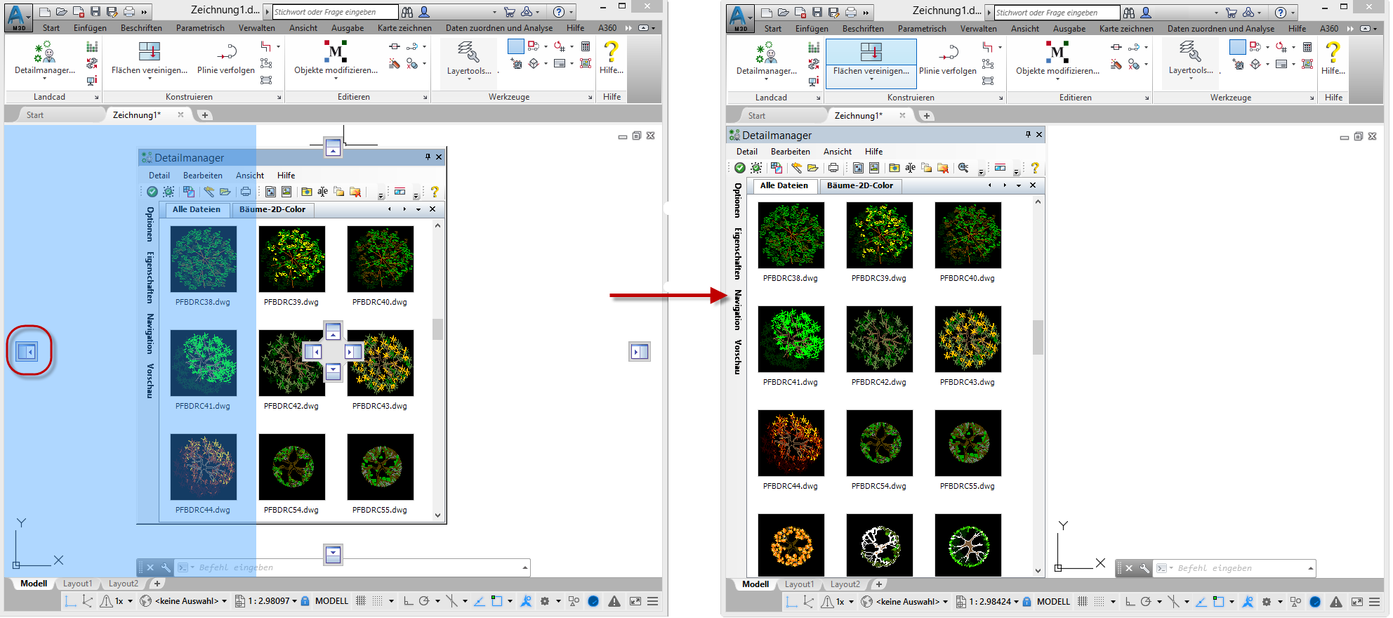 Ein Managerdialog lässt sich jederzeit an allen vier Ecken des Grafikbereiches andocken, wobei sich der Zeichenbereich entsprechend verringert aber vollständig verfügbar ist und nicht verdeckt wird.
