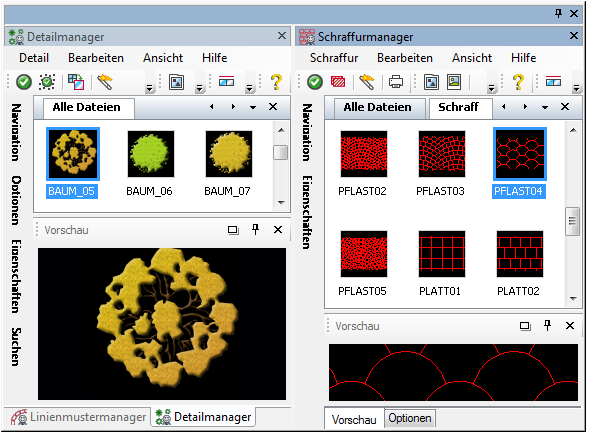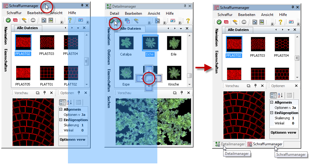 Positionieren Sie dazu den Cursor bitte auf die Titelzeile des zu verschiebenden Managers und halten Sie die linke Maustaste gedrückt. Wenn Sie den Dialog nun bei gedrückter Maustaste verschieben, werden ein Steuerkreuz mit Symbolen in der Mitte sowie die Symbole zusätzlich an allen vier Seiten eingeblendet. Gleichzeitig erscheint permanent die Lage des Dialoges als transparente Fläche. Das mittige Steuerkreuz bezieht sich stets auf das Fenster, in dem sich der Cursor aktuell befindet, z. B. auf den Zeichnungsbereich. Sobald der Cursor in den Bereich eines anderen Managers hineinragt, bezieht sich das Steuerkreuz auf dieses Programmfenster und ordnet sich auch hier mittig an. Sie können nun den Cursor in eines der Symbole verschieben, wobei Ihnen die entsprechende Lage und Größe des Dialoges ebenfalls virtuell angezeigt wird. Sobald Sie die Maustaste loslassen, wird der Manager in diesen Bereich integriert. Bei der zentralen Integration erscheinen Registerkarten der jeweiligen Manager am unteren Dialogrand. Der Wechsel zwischen den Managern erfolgt durch Anklicken der jeweiligen Registerkarte.