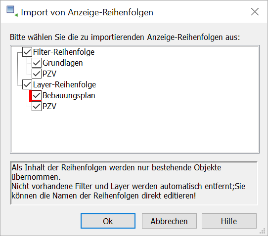 Die gewünschten Inhalte lassen sich mit dem jeweiligen Häkchen an- bzw. abwählen. Bereits in der Zeichnung vorhandene namensgleiche Reihenfolgen werden rot hinterlegt. Beim Import werden diese durch ein Suffix hochgezählt. Aus der Layer-Reihenfolge "Bebauungsplan" wird dann z. B. "Bebauungsplan_1". Die Namen lassen sich aber bereits im Importdialog editieren, wenn ein Doppelklick darauf ausgeführt wird. Des Weiteren ist zu beachten, dass immer nur bestehende Objekte importiert werden können, da hier keine Filter oder Layer entstehen, sondern Reihenfolgen. |