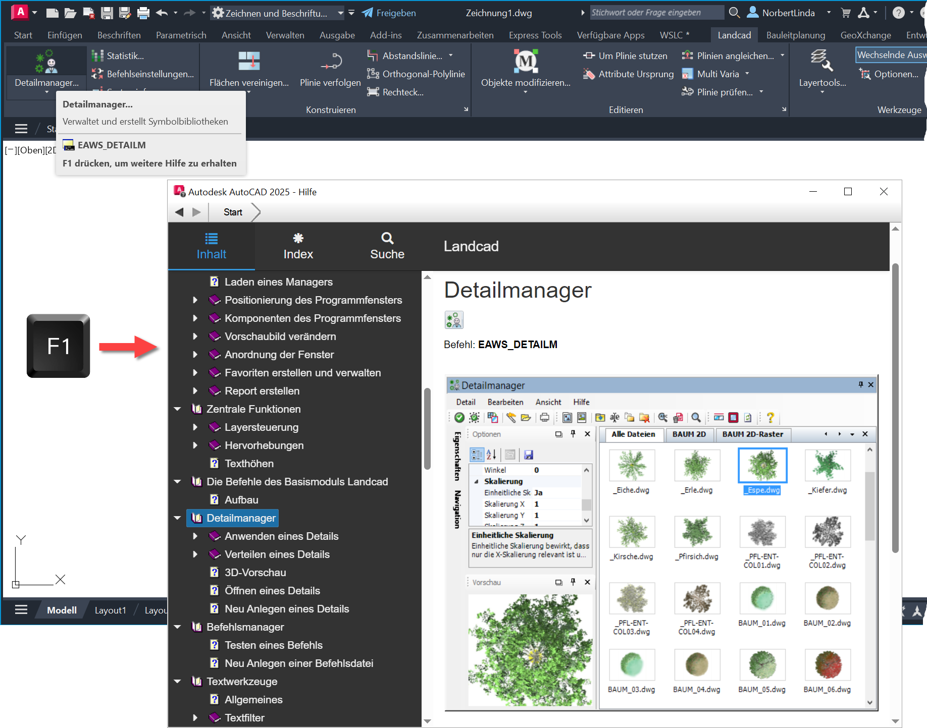 WS LANDCAD verfügt unter AutoCAD über eine Schnellhilfe, die durch Drücken der Funktionstaste F1 verfügbar ist, sobald ein Tooltipp zu einem Befehl erscheint. Hierbei wird direkt die Online-Hilfe zu dem jeweiligen Befehl aufgerufen, wobei bei umfangreichen Befehlen, die über mehrere Kapitel verfügen, jeweils zum betreffenden Anfangs-Kapitel gesprungen wird. F1 bei einem Hilfe-Icon öffnet die Online-Hilfe zum jeweiligen Modul im Einführungs-Kapitel. Die Anzeige der HTML-Hilfe erfolgt systembedingt in einem modifizierten AutoCAD-Hilfefenster.