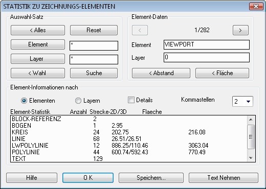 Der Statistik-Befehl zeigt Ihnen eine Auflistung über die von Ihnen gewählten Zeichnungs-Elemente, sowohl nach Element-Typ als auch nach Layer-Zugehörigkeit. Zusätzlich werden je nach Art der Elemente auch Strecken- und Flächenwerte berechnet und angezeigt.