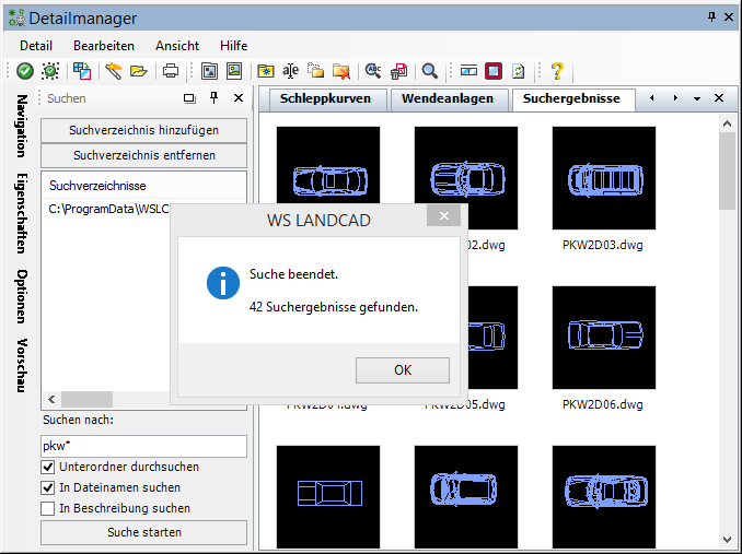 Die Schaltfläche Suche starten setzt die Suche in Gang. Alle Treffer werden in der Registerkarte Suchergebnisse angezeigt, welche automatisch zum Objektwahlfenster hinzugefügt wird. Gefundene Objekte lassen sich direkt anwenden.