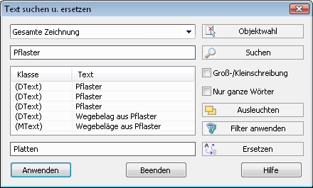 Die anschließende Suche durchsucht die Zeichnung bzw. Selektion nach dem zuvor eingegebenen Text und blendet alle Treffer in den Dialog ein, wobei sowohl nach der Klasse (DText oder MText) unterschieden wird als auch nach dem Vorkommen als einzelnes Wort oder innerhalb einer Textpassage.