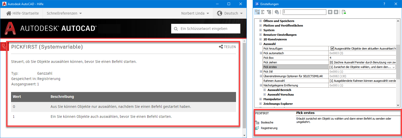 Zusätzlich kann durch Doppelklick in eine Zeile einer Systemvariable die dazugehörige Beschreibung aufgerufen werden. In AutoCAD öffnet sich die Hilfe, während in BricsCAD die Einstellungen geöffnet werden.