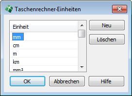 - Ergänzung – Zahlenwerte lassen sich automatisch mit den aktuellen Einheiten aus einer Klappliste versehen. Der Plus (+)- bzw. Minus (-) -Schalter fügt jeweils die aktuell gewählte Einheit hinzu oder entfernt sie wieder, während der Schalter für die Einheiten (E) einen separaten Dialog zum Editieren der Einheiten-Bezeichnungen öffnet.