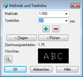 - Die Bestätigung des Dialoges Text einfügen fordert zum Zeigen des Einfügepunktes auf und platziert den Text gemäß der Einstellung der Optionen in der Zeichnung. Sollte in den Optionen die Texthöhen-Option „immer fragen“ aktiviert sein, erscheint zunächst der zentrale Texthöhendialog mit den aktuellen Einstellungen. Sie können dann bei Bedarf andere Werte verwenden.