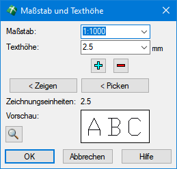 - Zeigen – Diese Schaltfläche ermöglicht die Texthöhenbestimmung durch das Zeigen zweier Punkte in der Zeichnung. Die daraus resultierende Texthöhe in mm wird dabei passend zum eingestellten Maßstab in das Eingabefeld übertragen.